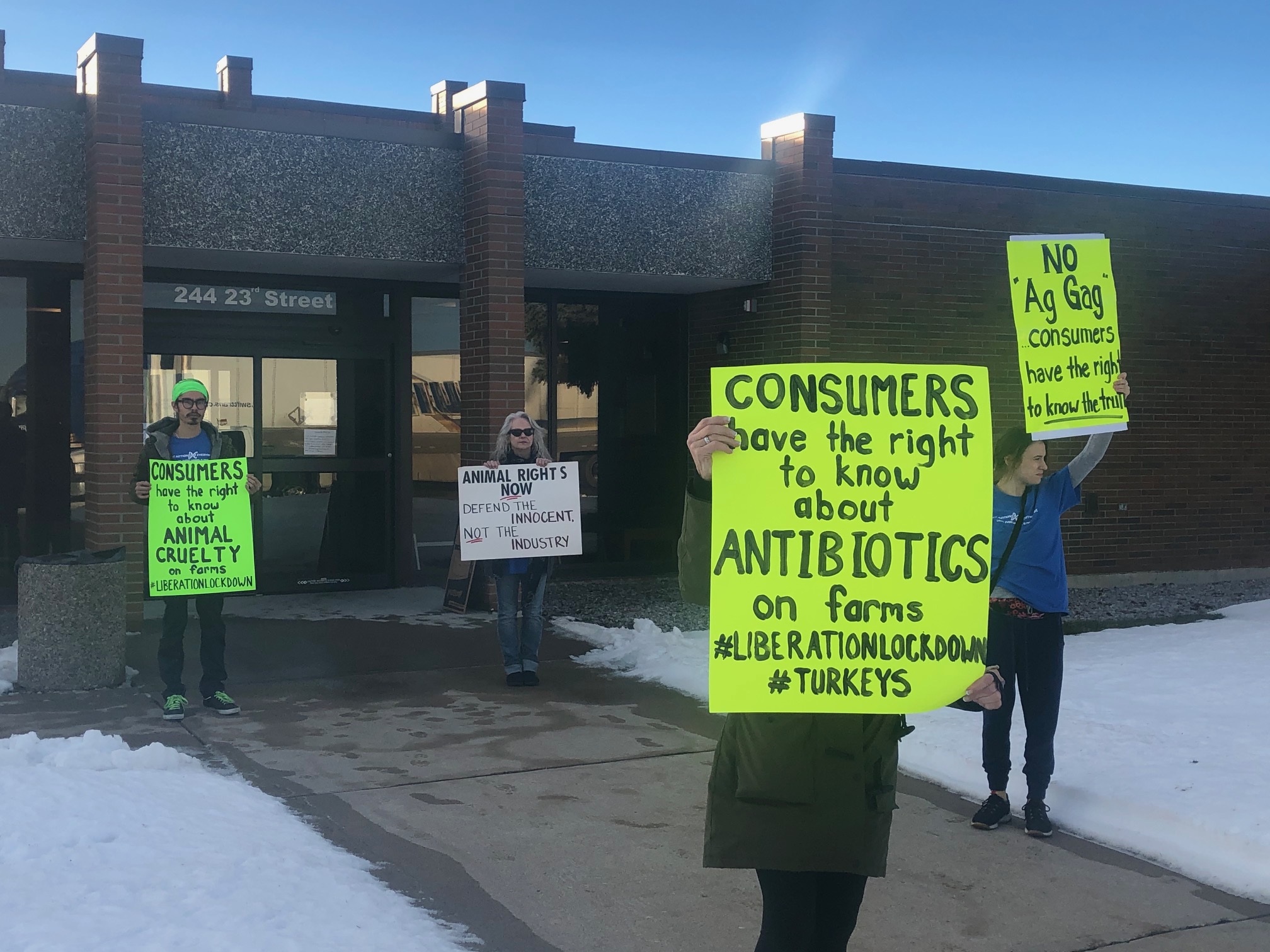 FORT MACLEOD, AB – About a dozen protestors stood in front of the small courthouse in Fort Macleod Wed. morning (Dec.4), holding signs reading “consumers have the right to know about animal cruelty,” and “you can’t arrest an entire movement.”