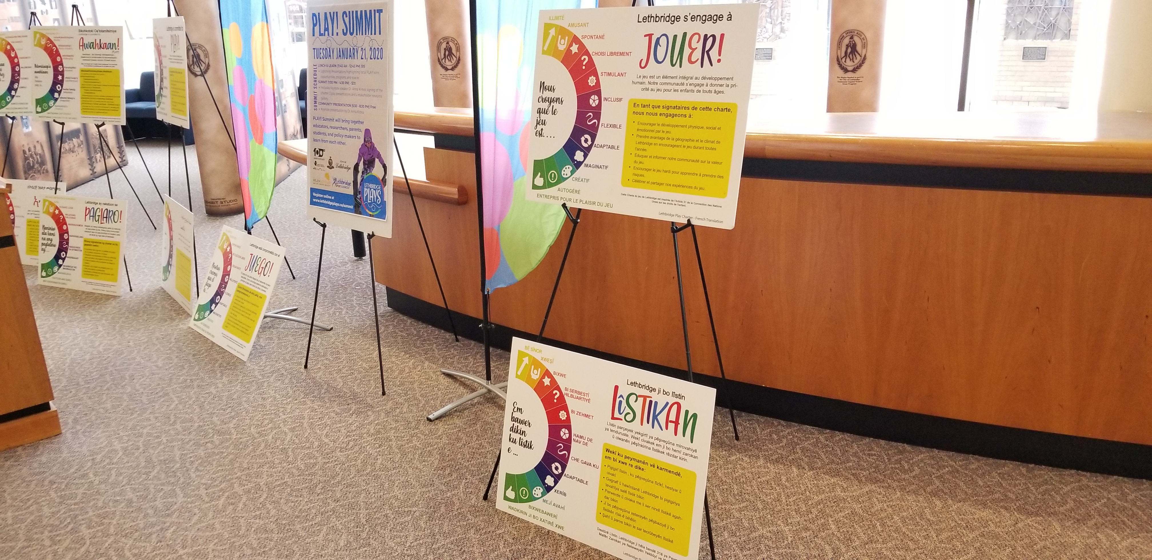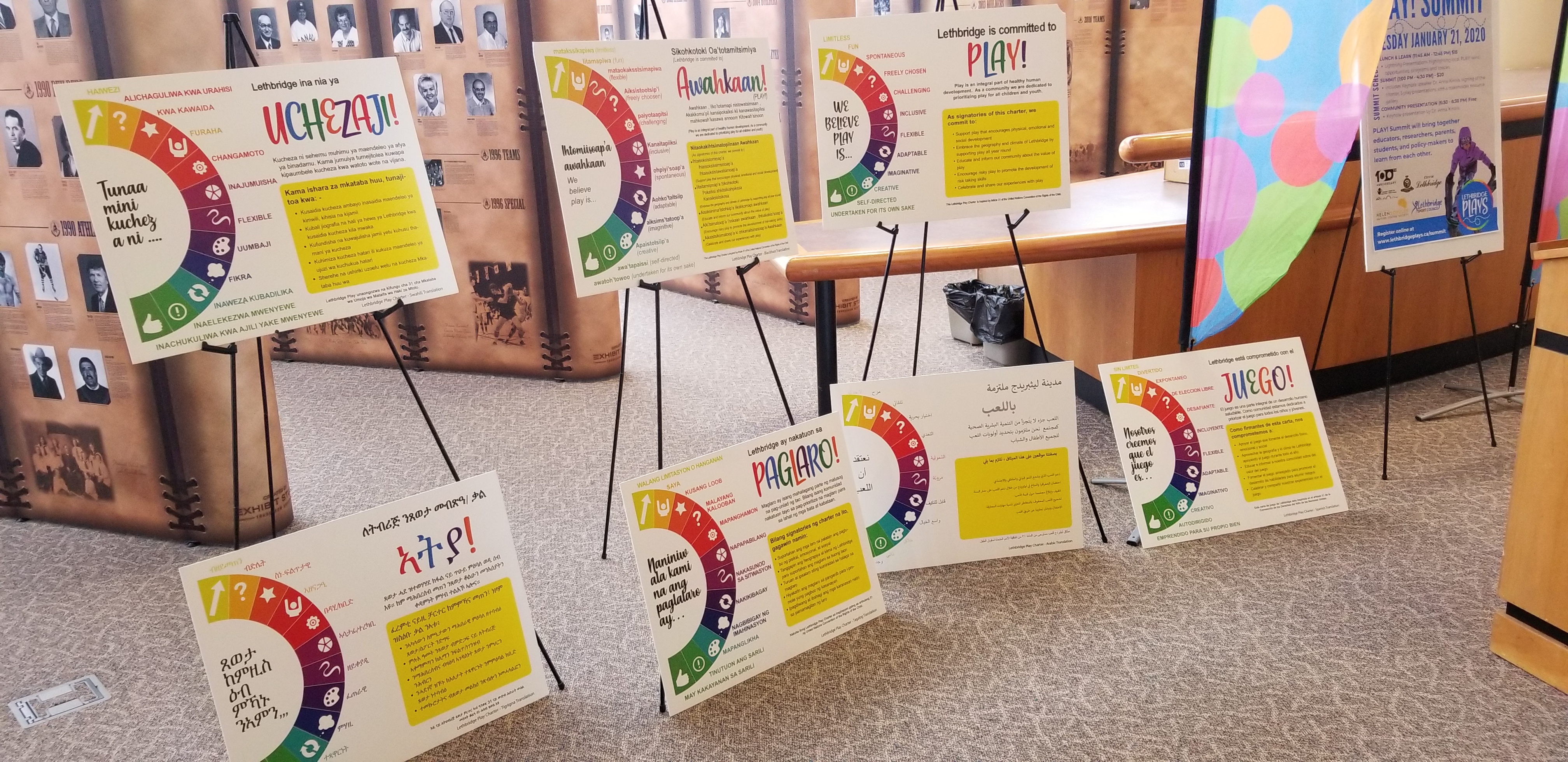 Some of the different versions of the Lethbridge Play Charter on display (Photo: Lethbridge News Now)