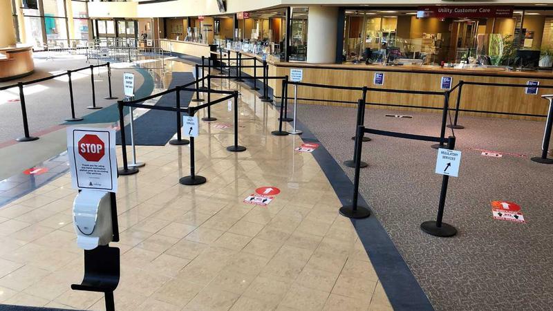 The foyer will have directions in place to ensure physical distancing and one-way foot traffic, as shown in the photo above. Hand sanitizer stations have been placed near the entrance.