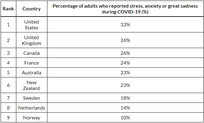 Our home and native land ranks third highest in the world at 26% of all adults who experienced either stress, anxiety, or great sadness with our mental health because of the domino effect COVID-19 had on the world.