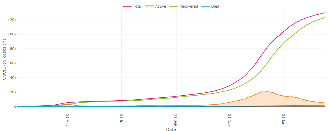 415 cases were confirmed across the province, bringing the total to 130,030. Of those, 4,887 cases are active while 123,338 people have recovered.