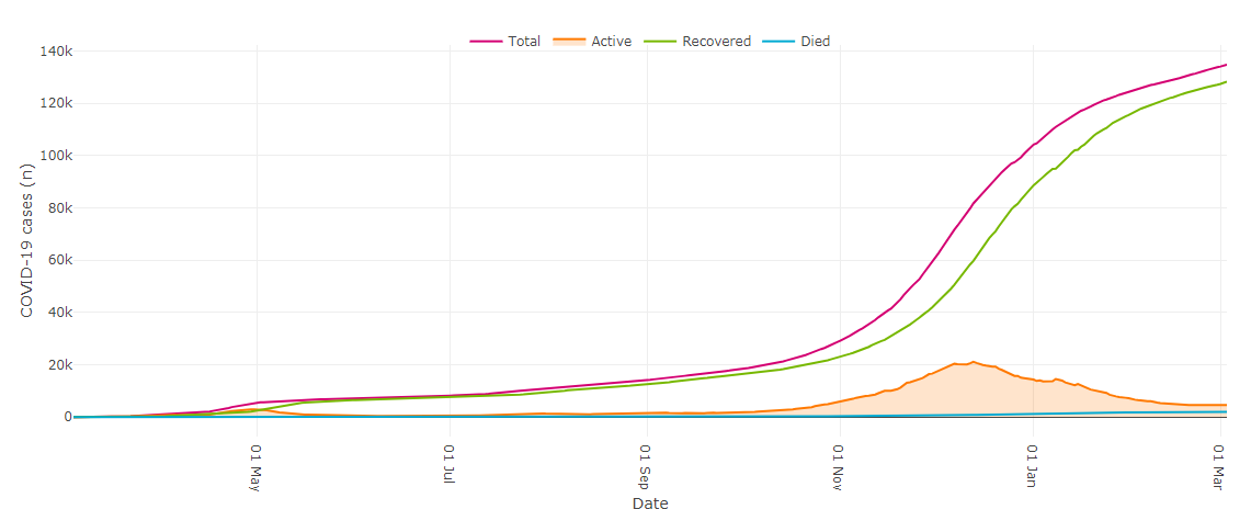 331 cases were confirmed across the province, bringing the total to 134,785. Of those, 4,613 cases are active while 128,261 people have recovered.