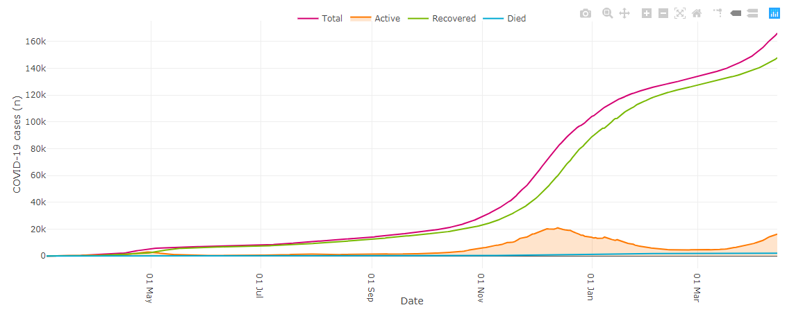 Below is a graph of how COVID-19 cases in Alberta have trended since the start of the pandemic, which can also be accessed with more detail here.