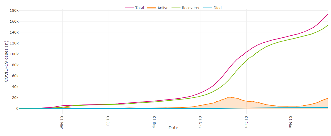 1,345 cases were confirmed across the province, bringing the total to 173,531. Of those, 18,481 cases are active while 153,002 people have recovered.