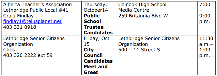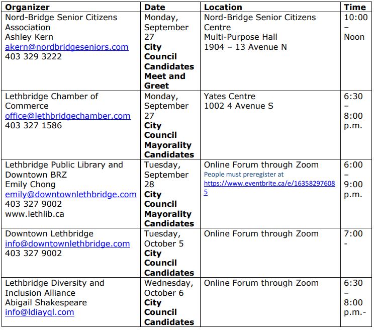 LETHBRIDGE, AB – If you are unsure of who to vote for in the upcoming municipal elections, you will have seven opportunities to learn more.