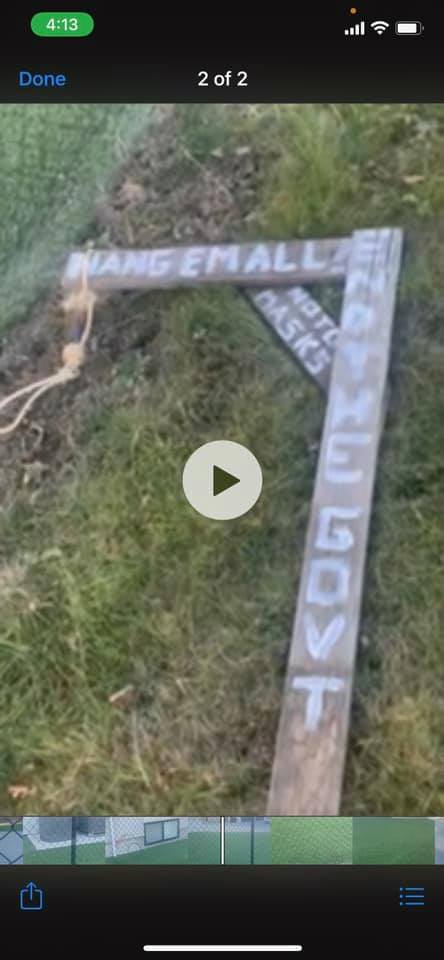 However, after the crowd left, she says a stand with a noose tied to it was left behind which had the phrase “no to masks, end the gov’t, hang ’em all” written on it.