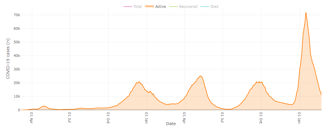 Below are graphs showing how COVID-19 in Alberta has trended since the start of the pandemic, which can also be accessed with more detail here.