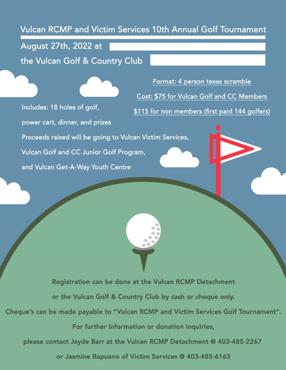 For golfers that feel like giving this weekend, the Vulcan RCMP is hosting the Vulcan RCMP and Victim Services 10th Annual Golf Tournament on Saturday, August 27, 2022. Starting bright and early at 10:00 a.m., the format for the tournament is a four-person Texas Scramble, and entry into the tournament costs $75.00 for Vulcan Golf and Country Club members, or $115.00 for non-members. Your entry into the tournament includes 18 holes of golf, power cart rental, dinner, and the chance to win some great prizes. All proceeds from the tournament will be split amongst the Vulcan Victim Services, Vulcan Golf and Country Club Junior Golf Program, and the Vulcan Get-A-Way Youth Centre. Jasmine Rapuano of Vulcan Victim Services told Lethbridge News Now that as of Friday, August 26, 2022, there was still room for three more teams to participate.