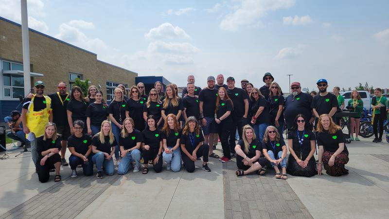 Students and staff, many of them wearing green, were brought to the front of the school for the Slow Your Roll event, put on in memory of former Coalbanks student Charles McIntyre. (Photo: LNN)