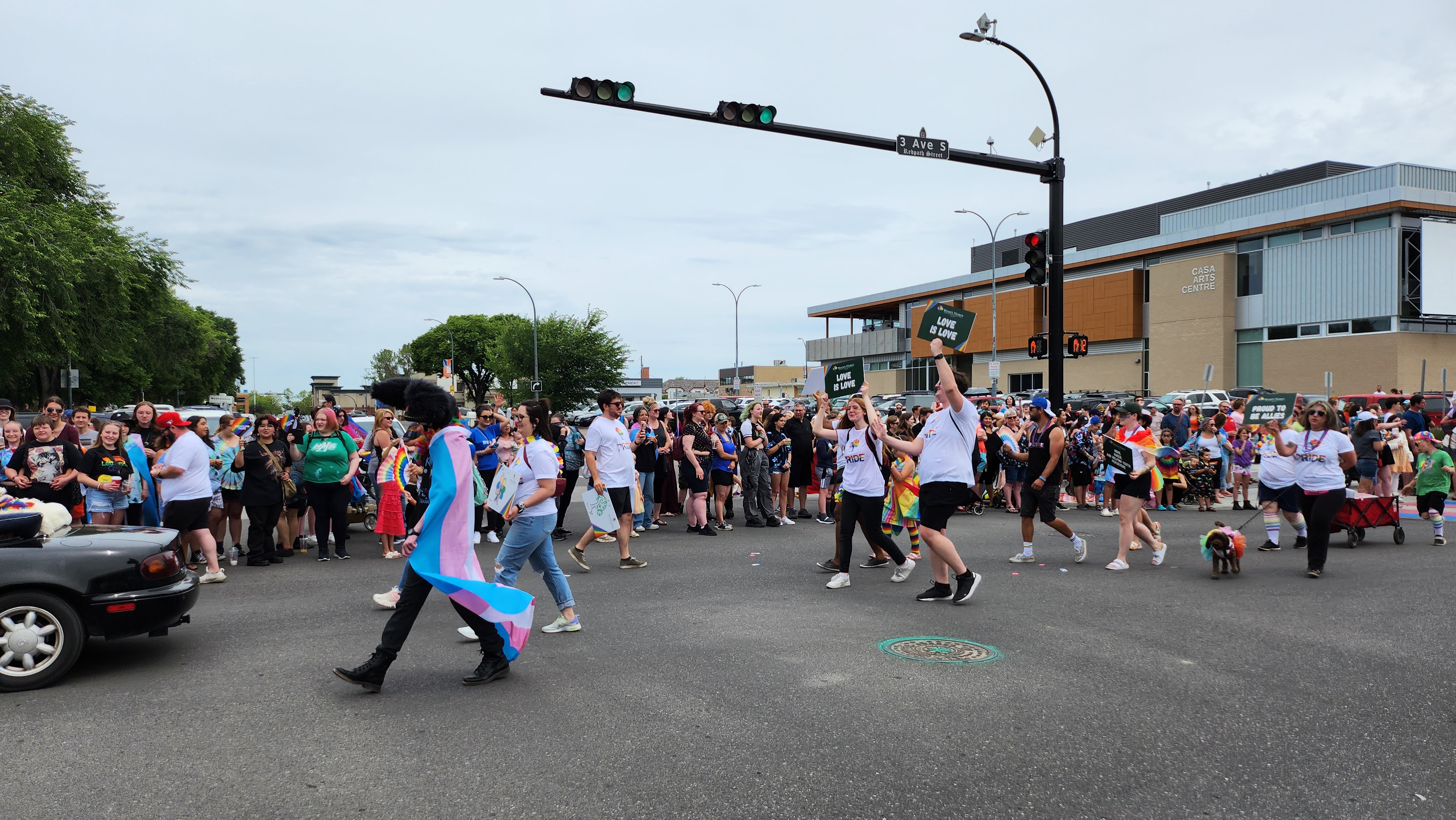 A vehicle and parade participants are seen crossing the Pride crosswalk at 7 St. S. and 3 Ave. S. in Lethbridge, June 24, 2023. (Photo: LNN)