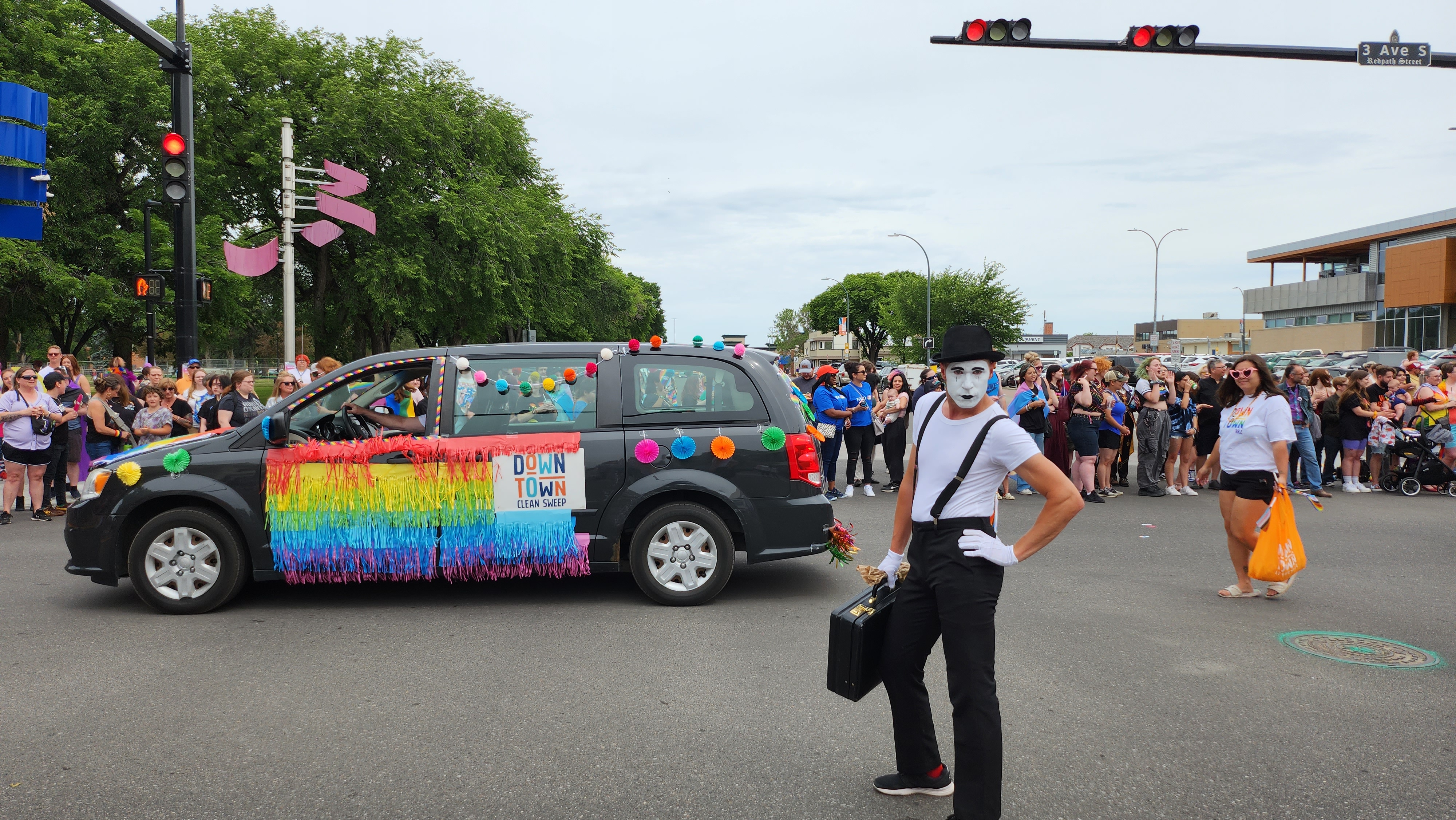 A mime featured during the Pride Parade, alongside a Downtown Lethbridge BRZ vehicle, June 24, 2023. (Photo: LNN)
