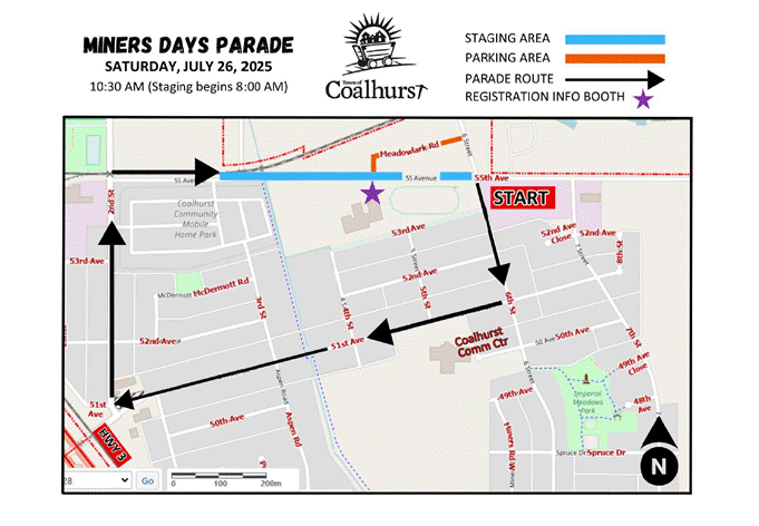 The parade route for Miners Day, scheduled for July 26, 2025. (Photo: Town of Coalhurst)
