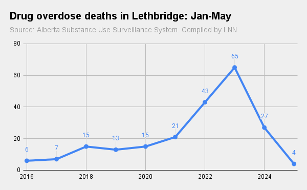 Although it still marks the lowest year-to-date total in at least the last decade, two people in Lethbridge died due to drug overdoses in May 2025.