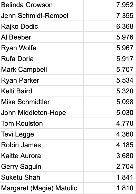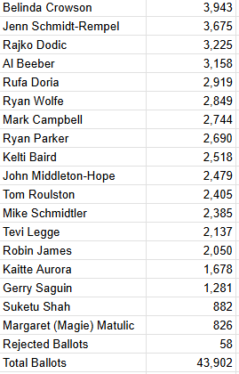 Eight seats are up for grabs, and currently, the leading candidates are Belinda Crowson, Jenn Schmidt-Rempel, Rajko Dodic, Al Beeber, Ryan Wolfe, Rufa Doria, Mark Campbell, and Ryan Parker.