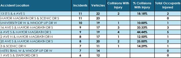The 10 intersections in Lethbridge with the most collisions in 2025. (Photo: Lethbridge Police Service)Given the “potentially devastating” impact of such collisions, LPS says it has a low tolerance for them.