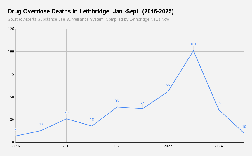 Drug overdose deaths in Lethbridge, Jan.-Sept. (2016-2025). (Source: Alberta Substance Use Surveillance System. Compiled by LNN)
