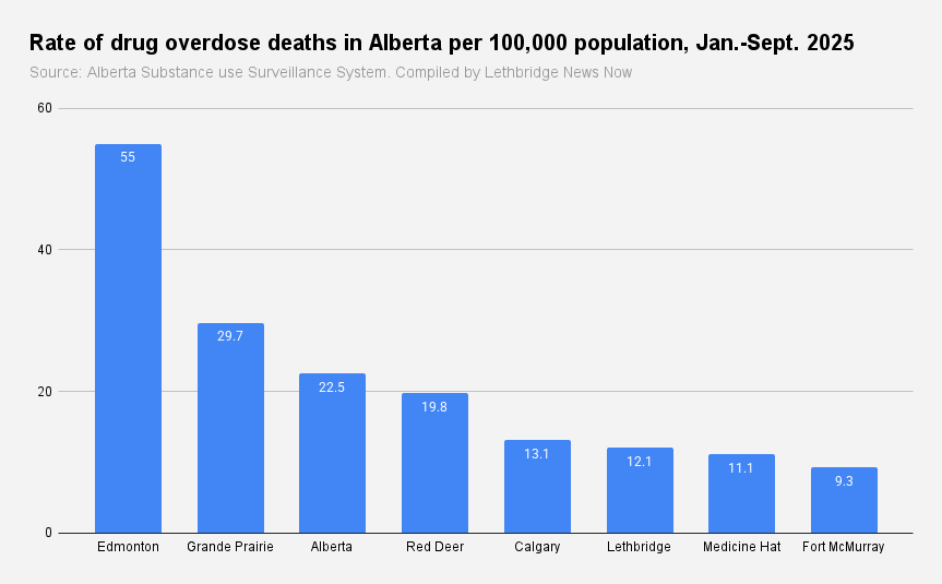 Lethbridge had a rate of 12.1 fatal overdoses per 100,000 residents between January and September, which is just over half of the provincial rate of 22.5.
