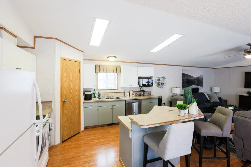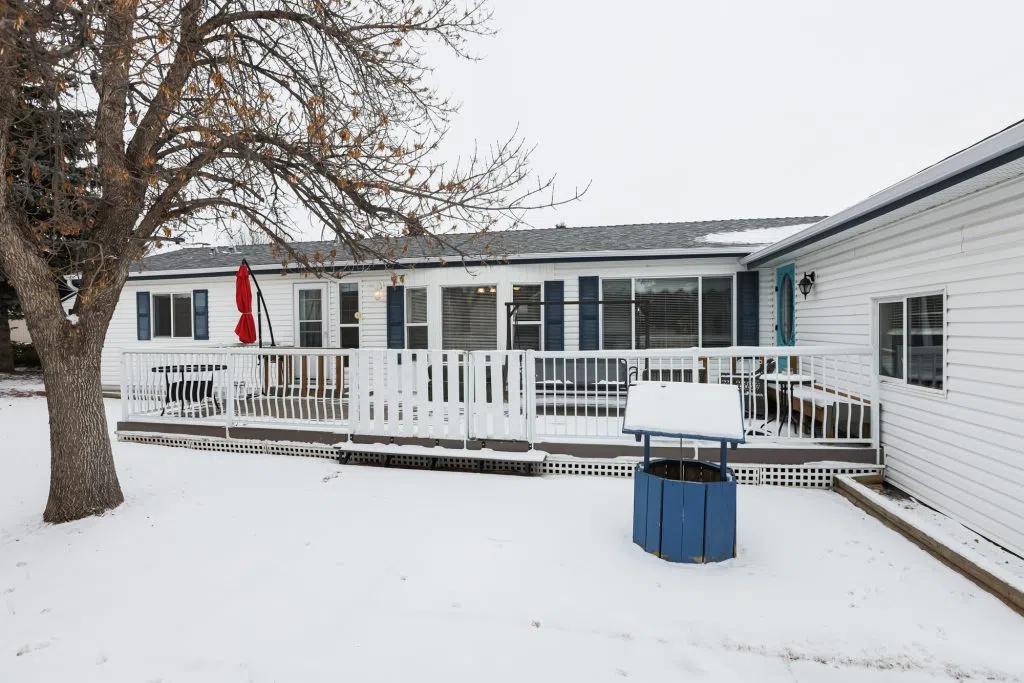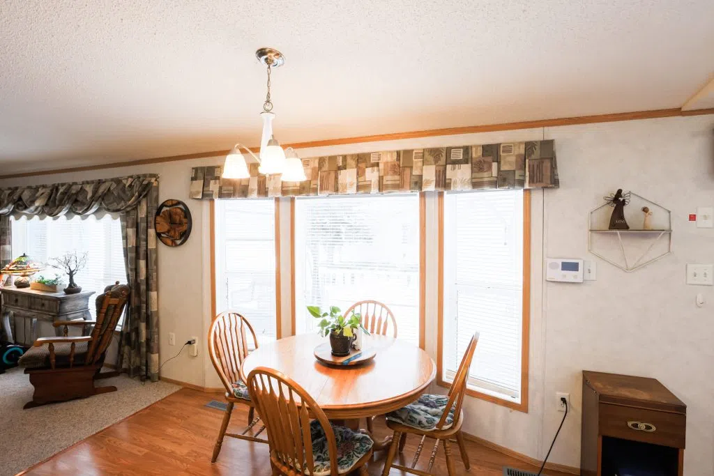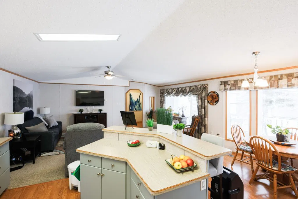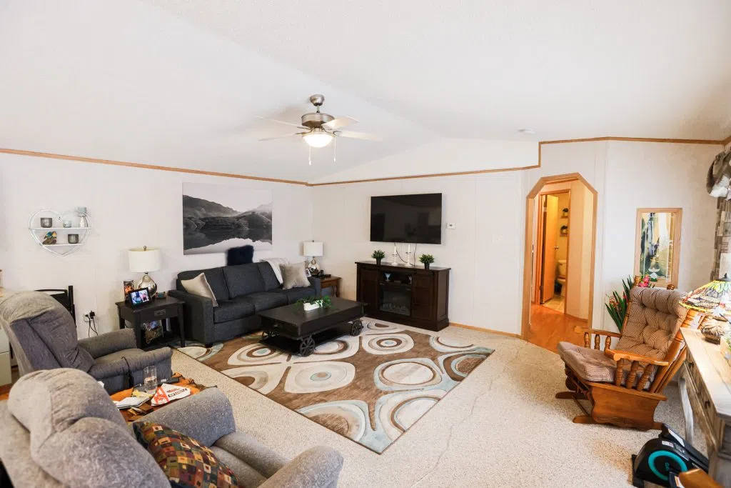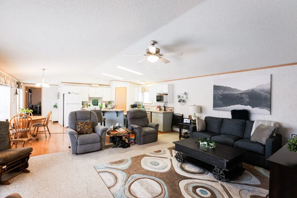 Welcome to Parkbridge Estates, a desirable 55+ adult living community known for its exceptionally well-maintained manufactured homes, scenic pond, and peaceful walking paths throughout the park. Enjoy worry-free living with snow removal and lawn care included in the maintenance. This well-cared-for home offers four bedrooms and two bathrooms, providing flexibility for guests, a craft or sewing room, home office, or additional TV space. The spacious living room features vaulted ceilings and central air conditioning for year-round comfort. The kitchen includes a corner pantry, breakfast bar, and ample workspace, with two convenient entrances into the home. The primary bedroom is privately located at the back of the home, while the remaining three bedrooms are positioned at the front. just off the primary bedroom is laundry with ample storage and raised laundry on pedestals. An oversized single garage (16’ x 20’) is connected to the home by a breezeway and includes a chairlift for added accessibility. A large deck extends your living space outdoors, and has separate storage shed provides additional storage. Parkbridge Estates also offers a welcoming common area for residents to gather, and its south location provides easy access to shopping, restaurants, and everyday amenities. Land lease is $615 per month. A wonderful opportunity to enjoy low-maintenance, community-oriented living.